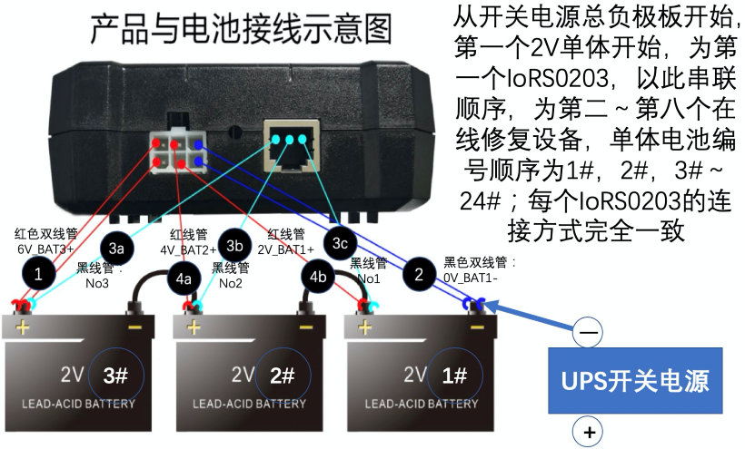 把IoRS0203的电池输入/输出接口电缆的黑色输出线连接到电池的负极,红色输出线连接到对应电池的正极柱,注意请按线标号正确连接(如上图标示)。