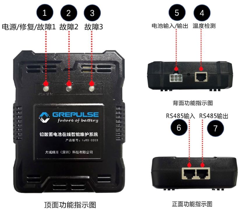 双色LED,红色闪亮表示低位电池通道故障,绿色灯常亮表示接入正常或暂停修复状态,绿色灯闪烁表示进入修复或维护工作状态。注1 注2 |